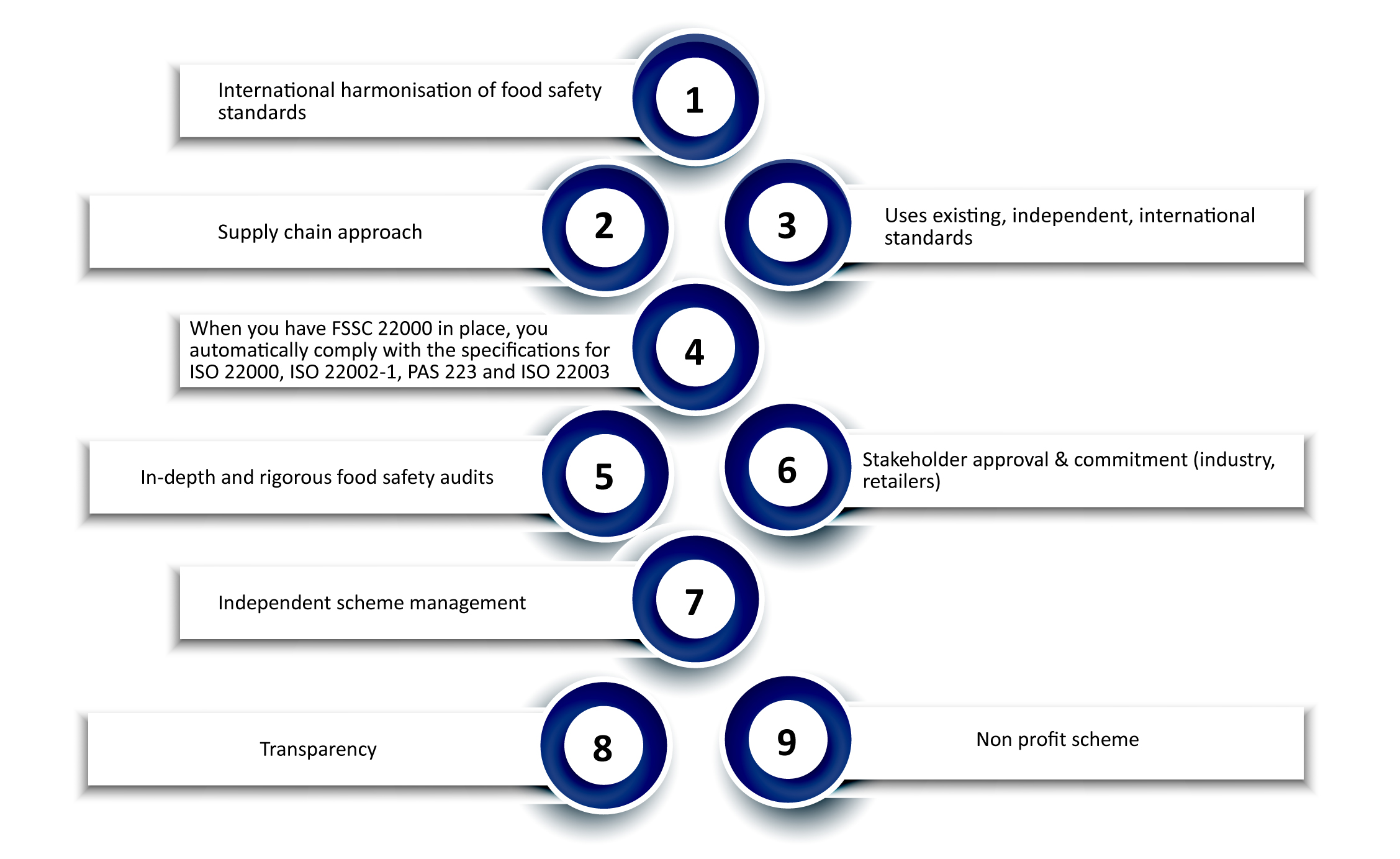 FSSC 22000 contains a complete certification scheme for Food Safety Systems based on existing standards for certification (ISO 22000 Food Safety, and ISO 22002).