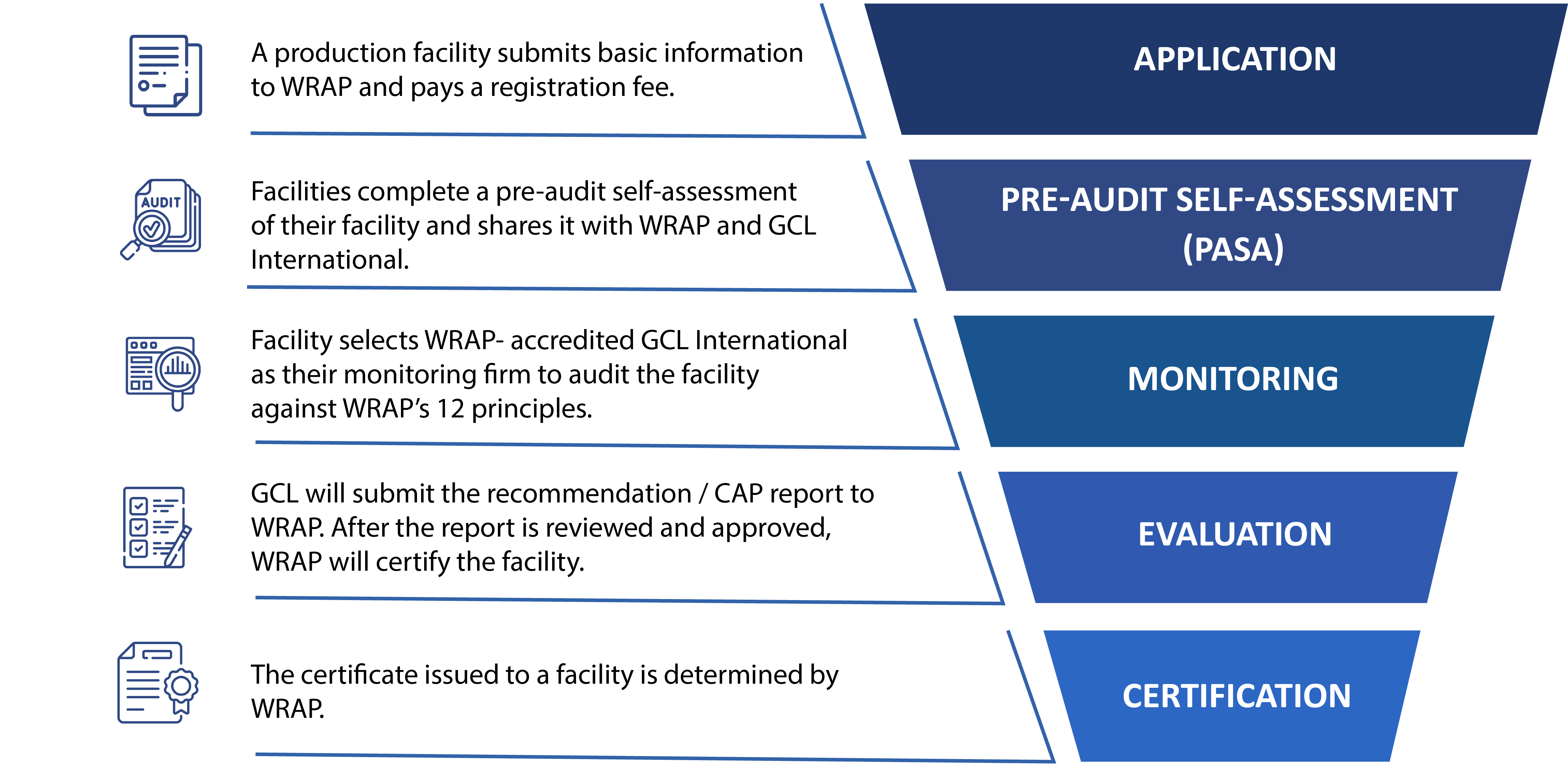 GCL International only engages WRAP Approved Auditors with APSCA Membership to conduct WRAP audits, as per WRAP requirements. GCL conducts all WRAP activities with the highest degree of honesty, transparency, and commitment to WRAP values and Principles.